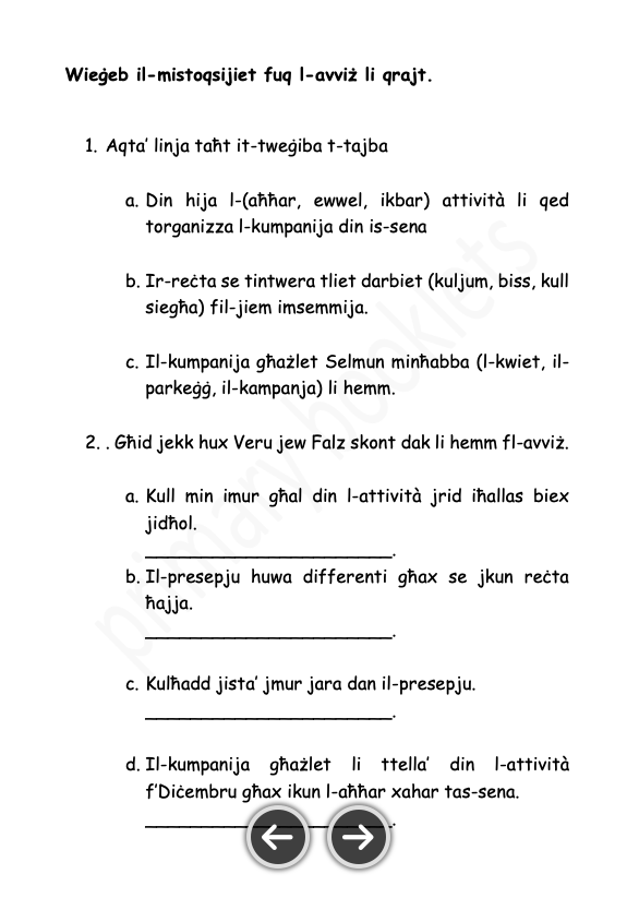 Year 5 Maltese – Malti Taħrig il-fehem (Comprehension)